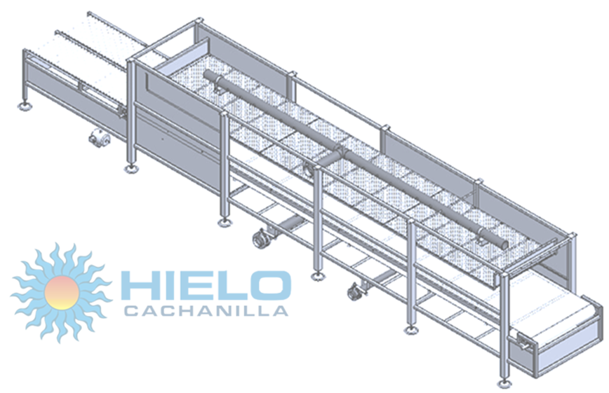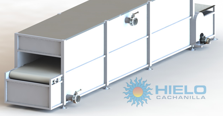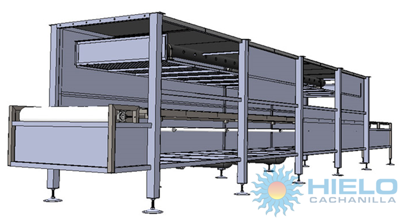 The band moves the product at a velocity determined by the thermal properties of the food as well as water and food temperature. Water usage is minimal, the water that previously absorbed the heat is recycled and recooled to make efficient cooling system.