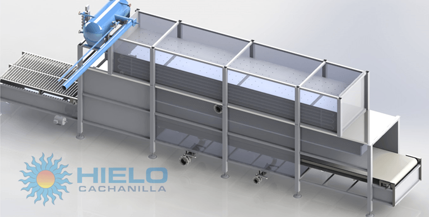 La banda mueve el producto a una velocidad determinada por las propiedades termicas del alimento asi como la temperatura del agua y el alimento. El gásto de agua es mínimo, pues se recircula el agua que absorbió previamente el calor y se reenfría para eficientizar el sistema de refrigeración.